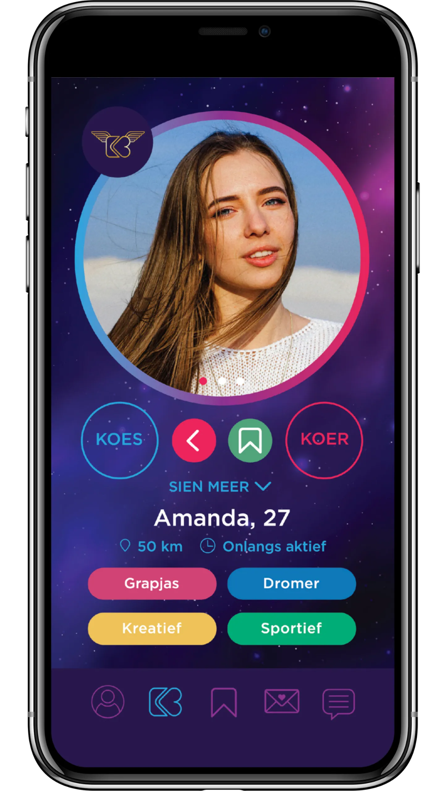 KOER gebruik jou gekose instellings, voorkeure en ligging om vir jou die mees geskikte profiele te wys. Vat ‘n kans! Hoe wyer jy jou net gooi, hoe meer visse in jou see. Wie weet, jou volgende date is dalk net om die draai!