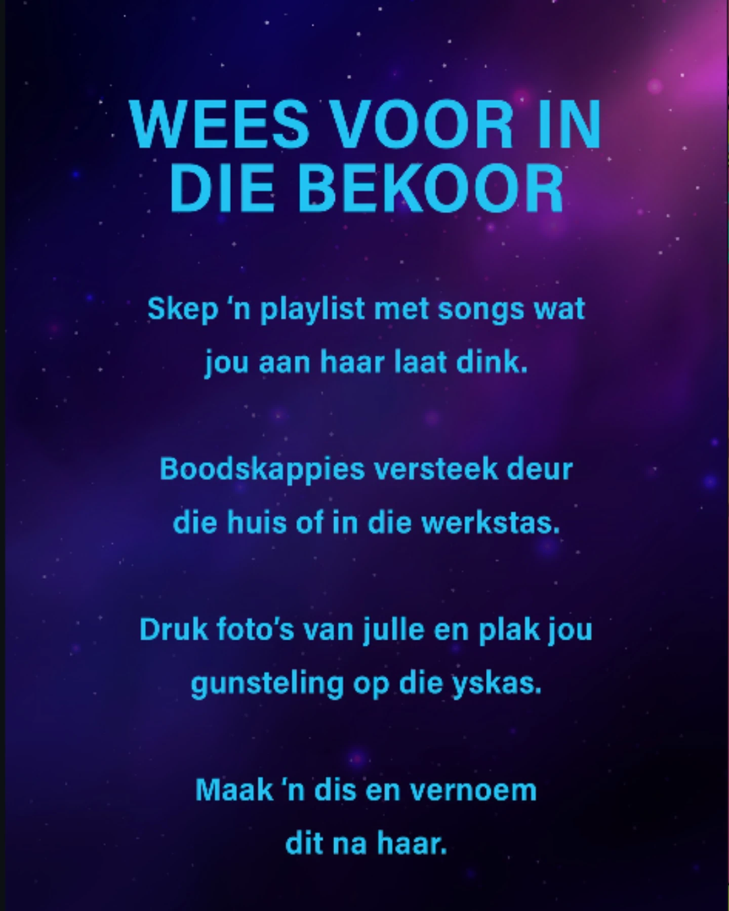 ’n Mens voel soms of jy op moedverlore vlakte sit, maar liefde kom wanneer jy dit die minste verwag... Baie dankie, KOER. As dit nie vir julle was nie, sou ek nooit my trouman ontmoet het nie.