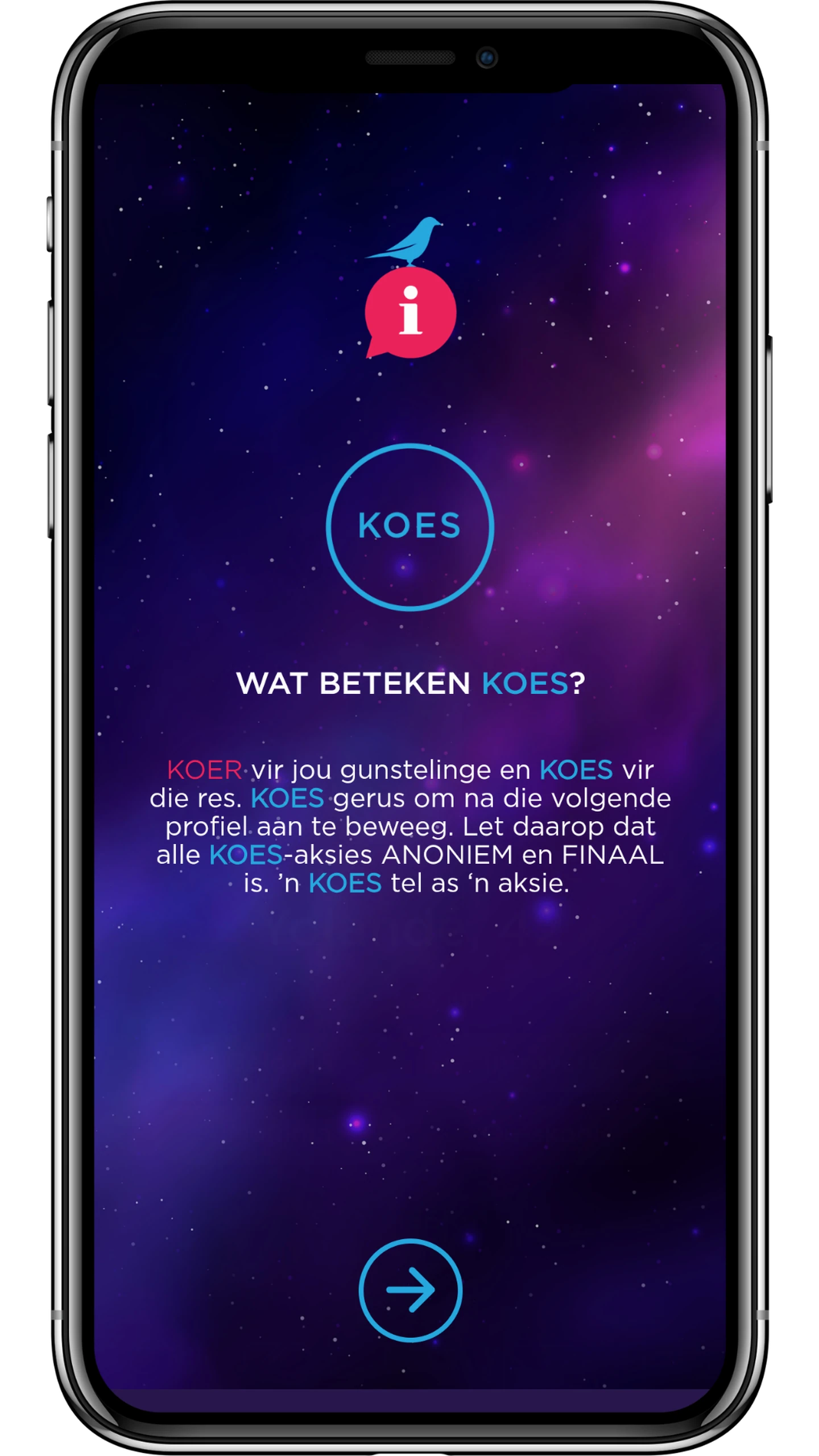 KOER is die Afrikaanse maatsoek-app wat jou die kans gun om jou net wyer te gooi. Kies en keur uit ‘n wêreldwye poel potensiële pasmaats. KOER is ‘n platform waar jy in beheer is, ‘n veilige plek om hartsvriende en hartediewe, penmaats en pasmaats, kennisse en kamerade te ontmoet.