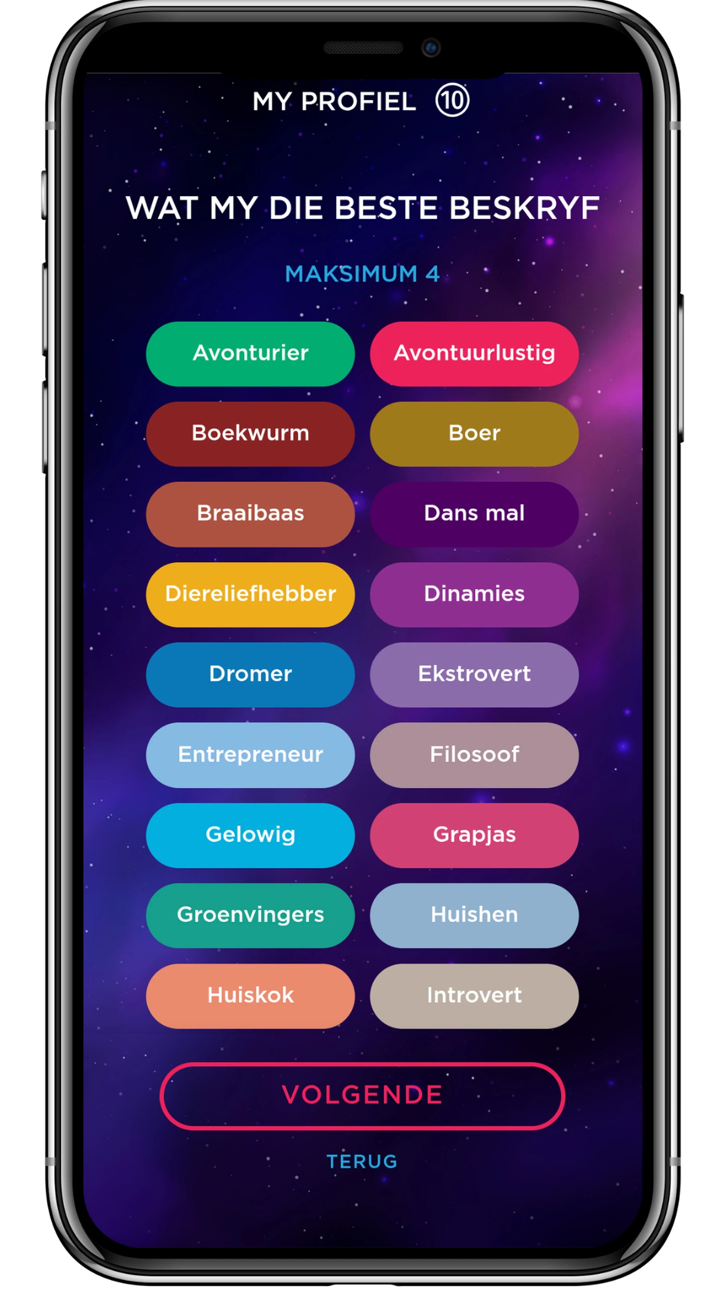 Van braaibaas tot spiertier, dromer tot jintelman – kies die eienskappe wat jou die beste beskryf en ontdek die kleurvolle karakters daar buite.